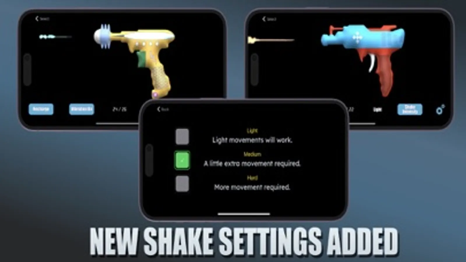 - Laser guns shoot on both touch or shake. Vibration automatically updates in premium version for all weapons.