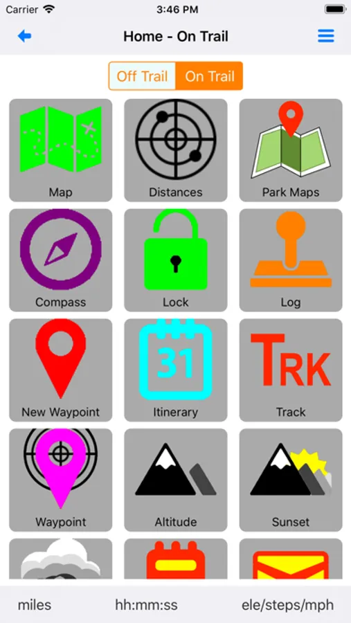 On and Off Trail modes optimize off-trail trip planning and on-trail usability. On-trail screens and maps use big controls, large text and present only key functionality.