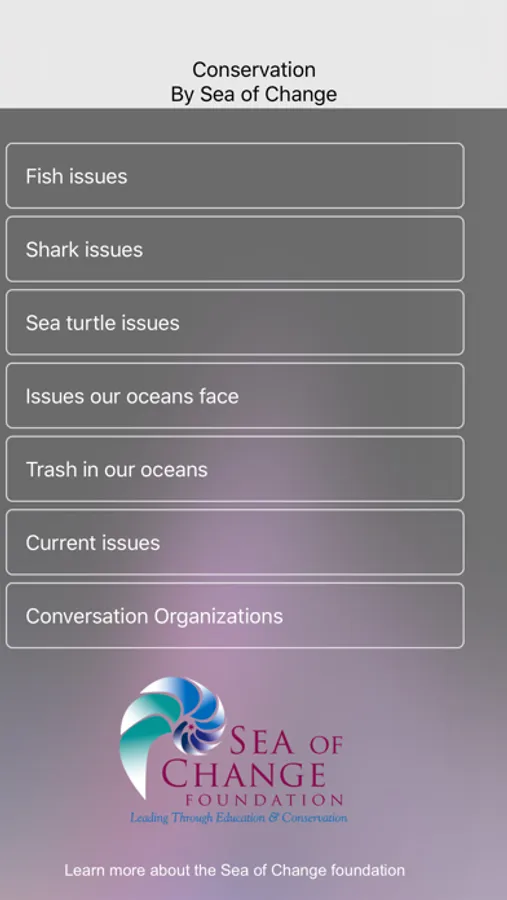 The Sea of Change Foundation is dedicated to supporting organizations who are making a difference in preserving the world's oceans educating youth about the marine environment and supporting future leaders with scholarships and research grants.