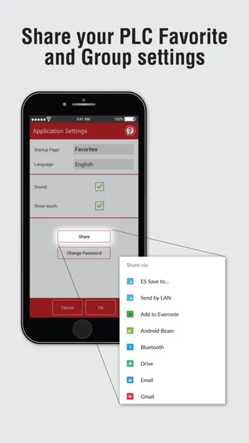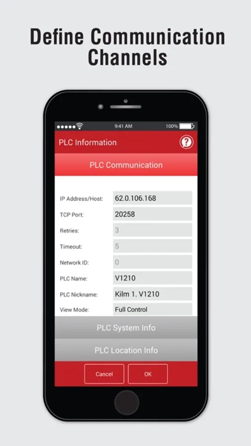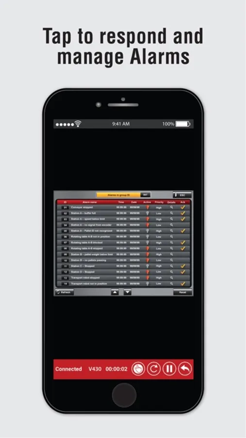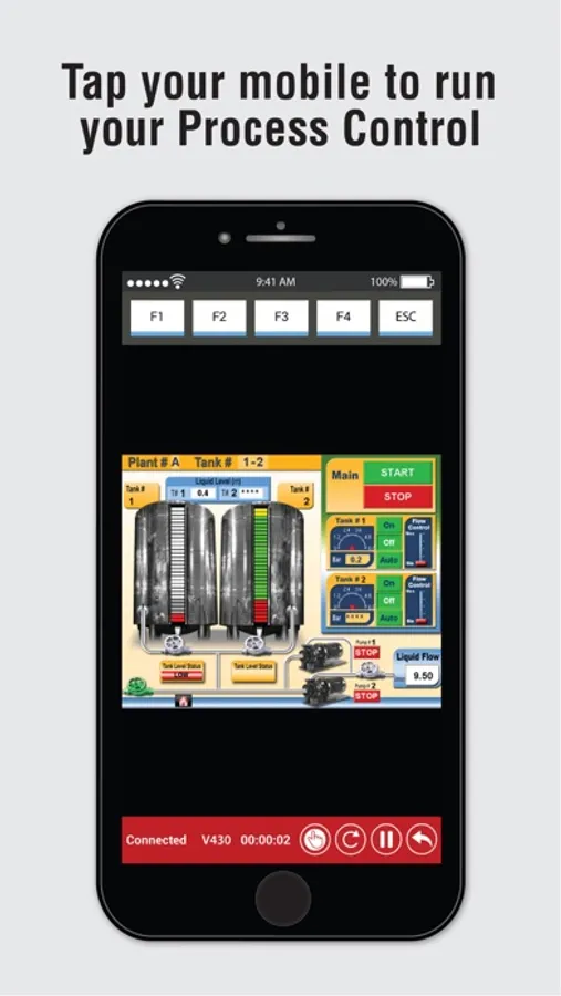 During a session, your mobile screen displays the PLC's HMI panel, along with a red Application Bar.