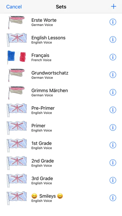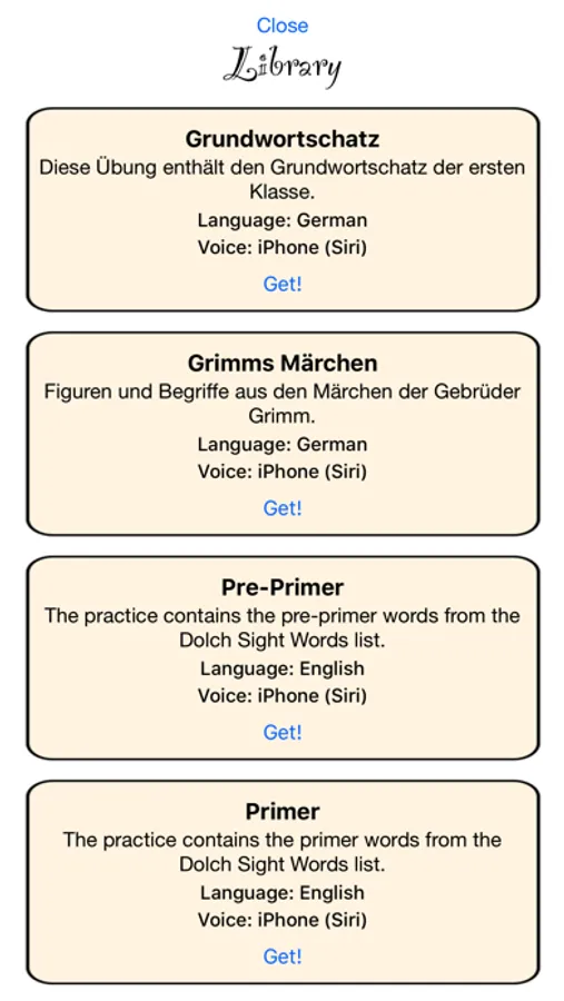 * Create arbitrary practice sets made of word lists in English, German and French or choose from the included library