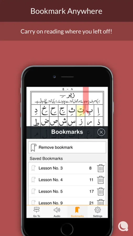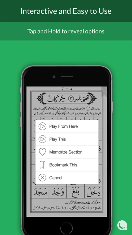 Simply tap and hold on any sentence or word to play the recitation, practice, and bookmark it.