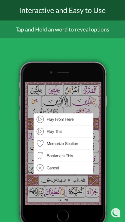 Simply tap and hold on any sentence or word to play the recitation, practice, and bookmark it.