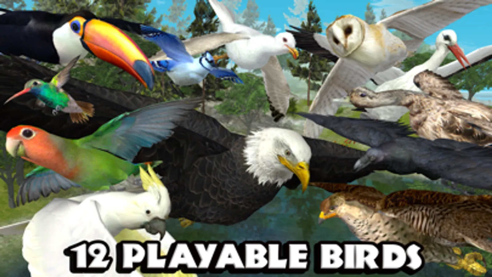 Soar into a brand new adventure as a majestic Eagle, swift Falcon, or a colorful Parrot! For the first time ever, choose from TWELVE PLAYABLE BIRDS! Hunt down food in a massive realistic world, lay eggs, raise your flock, and unlock exciting new playable birds as you experience the life of a bird!