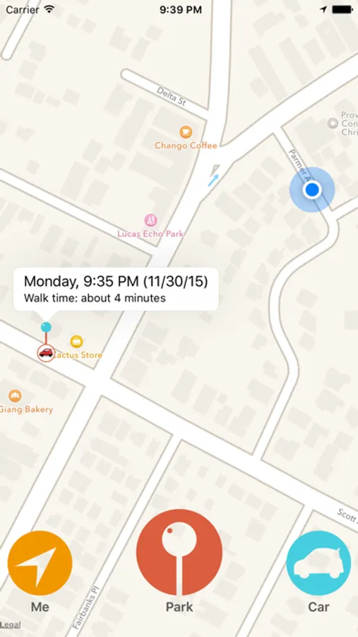 After parking, open up the app and hit "Park" to drop a pin at your current location (or, if your device supports 3D Touch, use the home screen Quick Action to save yourself a tap.) Later, you can refer to the pin for location, time and estimated walking distance. No need to go back and delete old pins. Next time you hit "Park," the pin simply updates to the new location and you're free to go about your business.