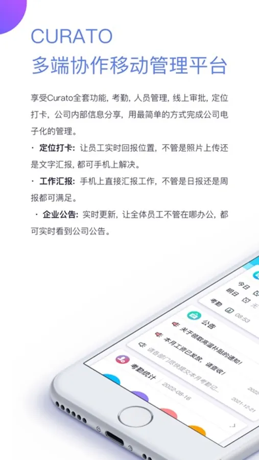 酷雷托是一款专为中小微型企业量身打造的考勤管理系统。将人脸识别打卡、外勤定位签到、排班与考勤统计、移动审批、电子签名、员工汇报、公告与多媒体展示等实用功能集于一体,支持多终端操作的考勤管理系统。酷雷托简化管理流程,操作方便易上手,在帮助企业降低员工管理成本的同时有效提升考勤效率。