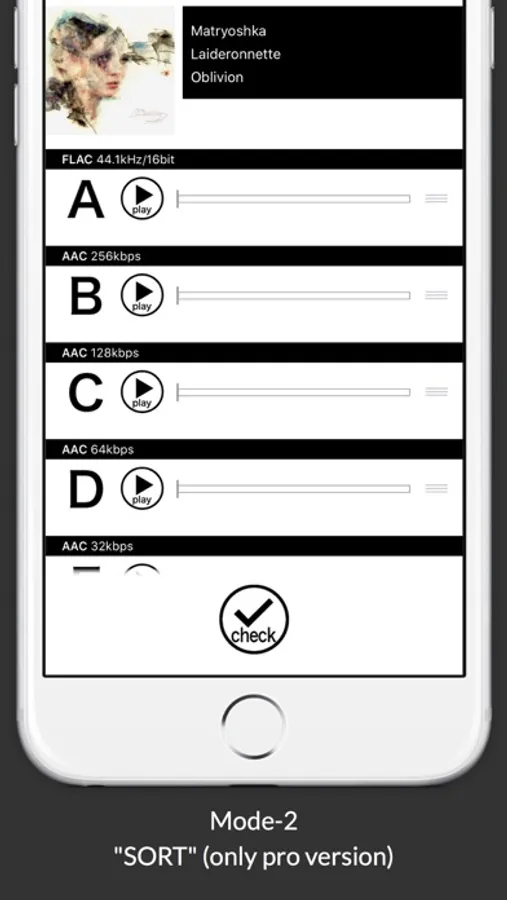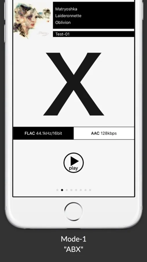 ABX Mode uses selected files transferred to the app via the iPod library or the "File Sharing" feature on iTunes to create AAC files of a user-specified sound quality (32 - 256kbps).