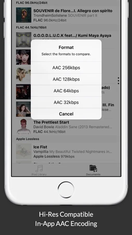 With hi-blind, sound source files in a variety of formats, including high-res sound sources, can be encoded in AAC so you can listen and compare quality.