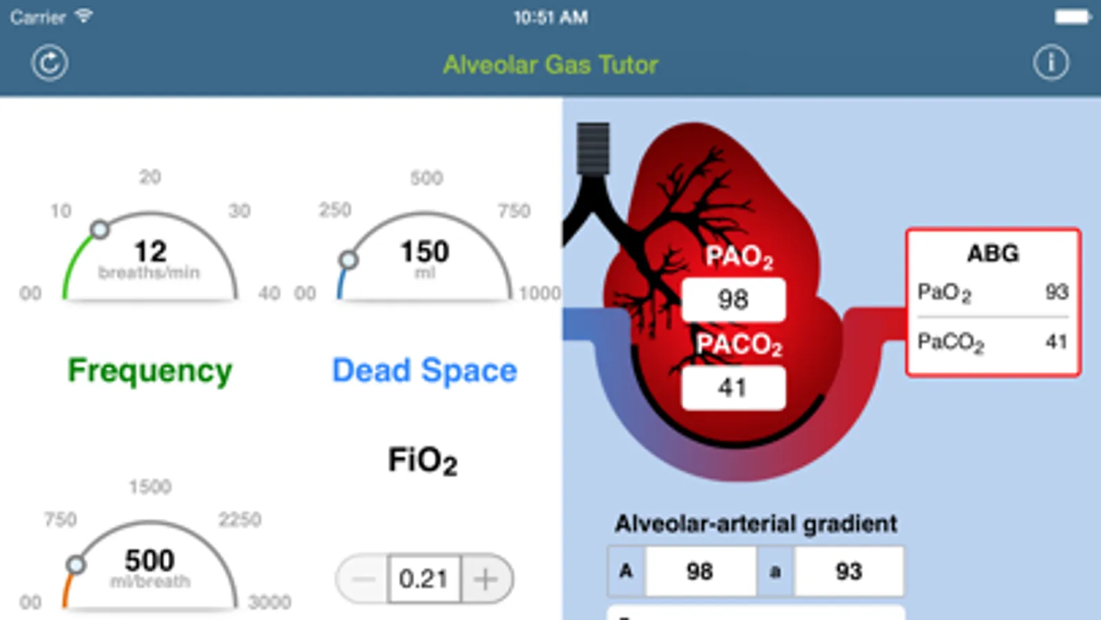 This app is designed to learn the correlation between respiratory variables [respiratory rate, tidal volume, dead space & fraction of inspired oxygen (FiO2)] and to know its impact on alveolar ventilation and blood gases.