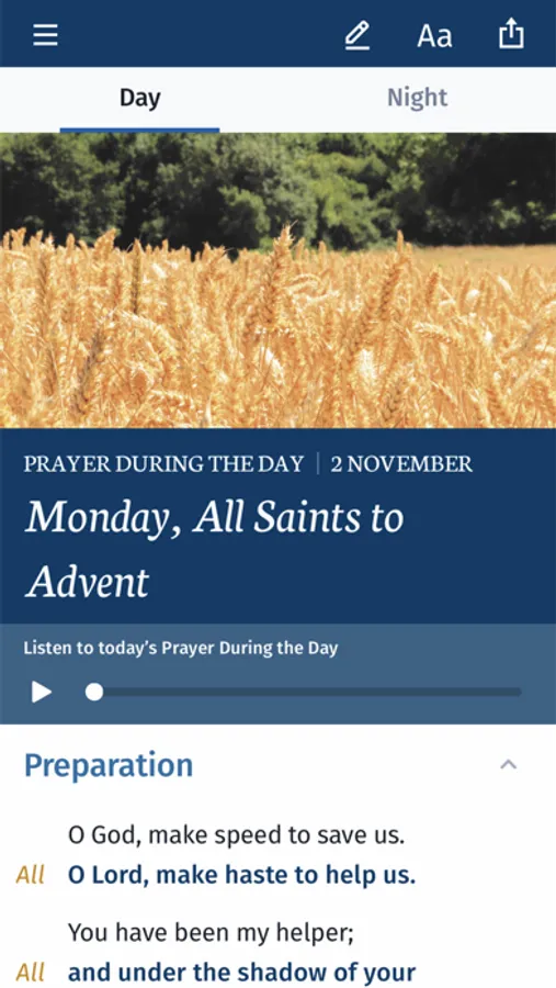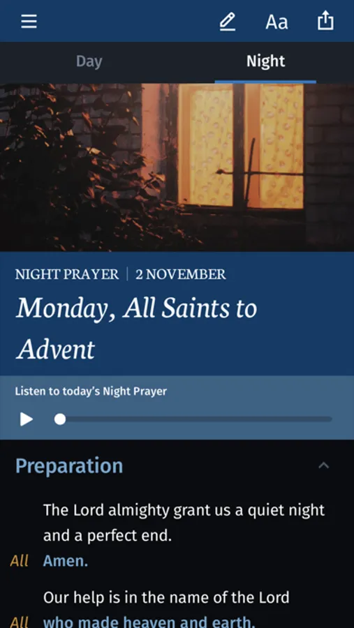 • Adjustable settings and timings. Use Settings to adjust the time of day the app shifts from Day to Night. And you can set reminders for one or more of the services to help you establish and maintain a rhythm of prayer throughout your day.