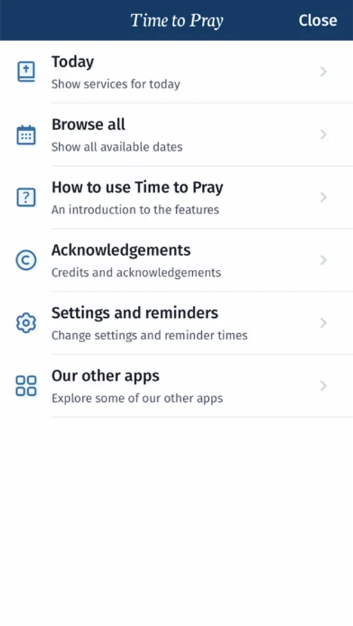 Many people choose to take time in the day for a daily Quiet Time, for reading the Bible and for praying. Time to Pray helps you to do this with the Church of England's Prayer During the Day, a short, simple service of prayers, psalms and readings that can be done at any time of day. The app presents everything you need to carry out Prayer During the Day, with variations according to the day of the week and the season of the Church’s year.