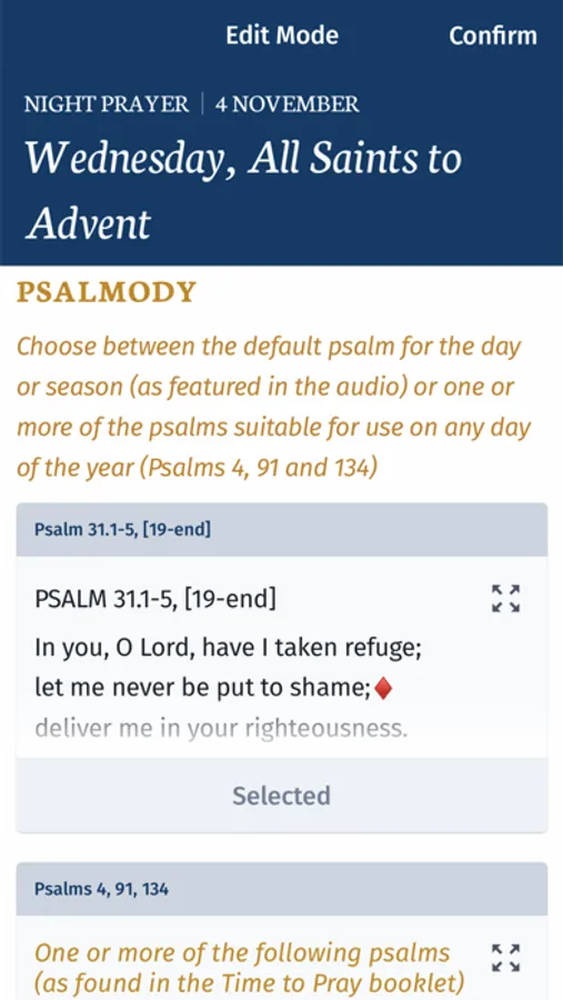 • Edit Mode. You can also use the 'pencil' icon to enter 'Edit Mode' and make choices about the psalms, prayers and readings in each service. The defaults mirror the content of the audio, but you are free to make other selections for psalms, readings and prayers based on the provisions of Common Worship: Daily Prayer.
