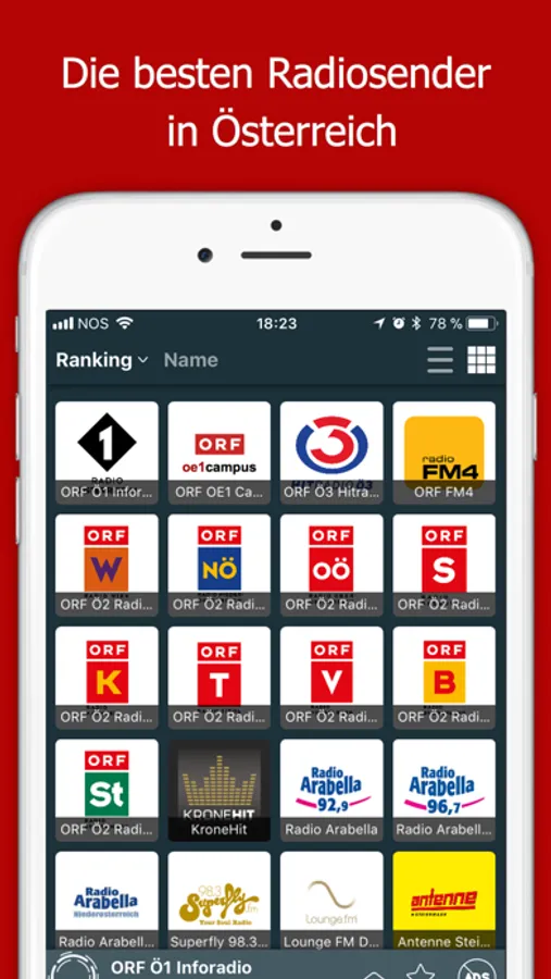 Mit Radio Österreich app kannst Du die besten Rundfunkstationen in Österreich anhören wie: ORF Ö3 Hitradio, ORF FM4, Lounge FM, KroneHit, Radio Arabella, 98.3 Superfly, ORF Ö2 Radio Wien, Antenne Steiermark, ORF Ö1 Inforadio und viele anderen.