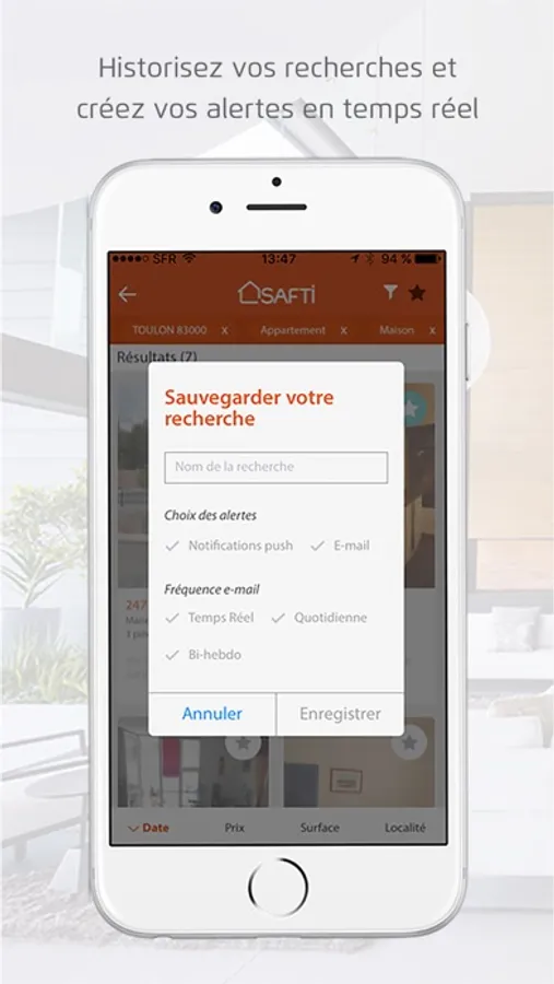 > Des notifications pushs et e-mails qui vous alertent en temps réel des nouvelles annonces correspondant à vos critères de recherche.