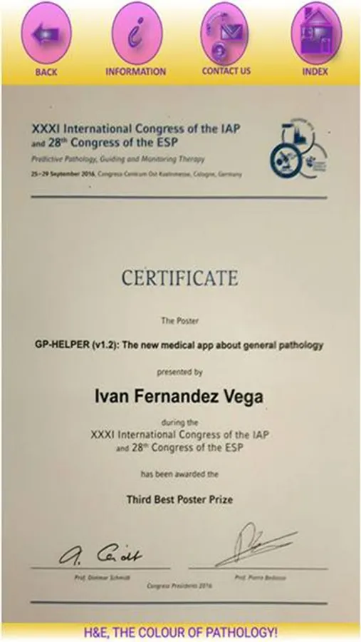 TECHNICAL NOTE: Fernandez-Vega I. General pathologist-helper: The new medical app about general pathology. J Pathol Inform 2015;6:61. Available FREE in open access from: http://www.jpathinformatics.org/text.asp?2015/6/1/61/170648