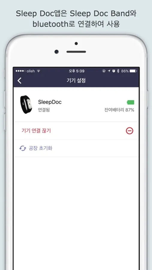 • Sleep Doc앱은 Sleep Doc 웨어러블 밴드와 bluetooth로 연결하여 사용 하실 수 있습니다.