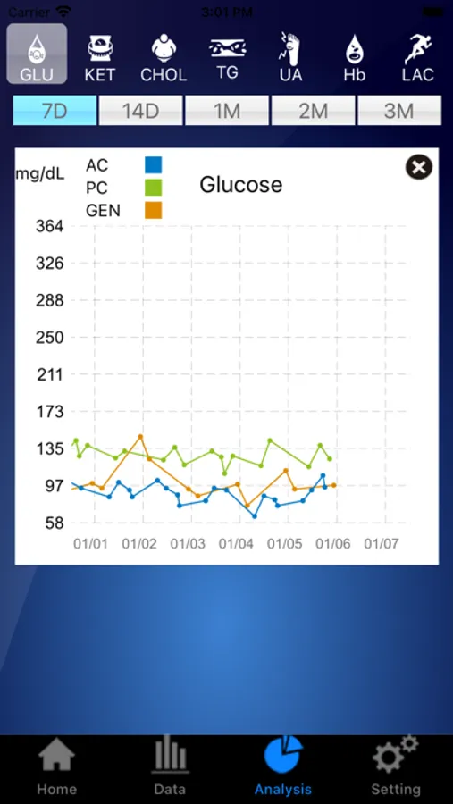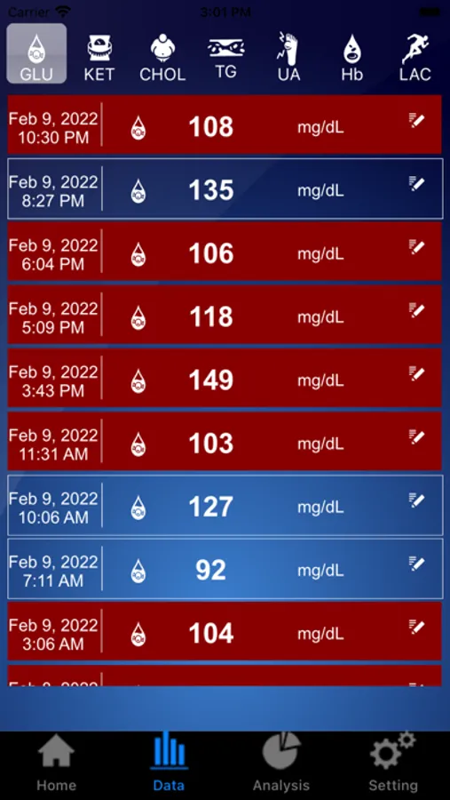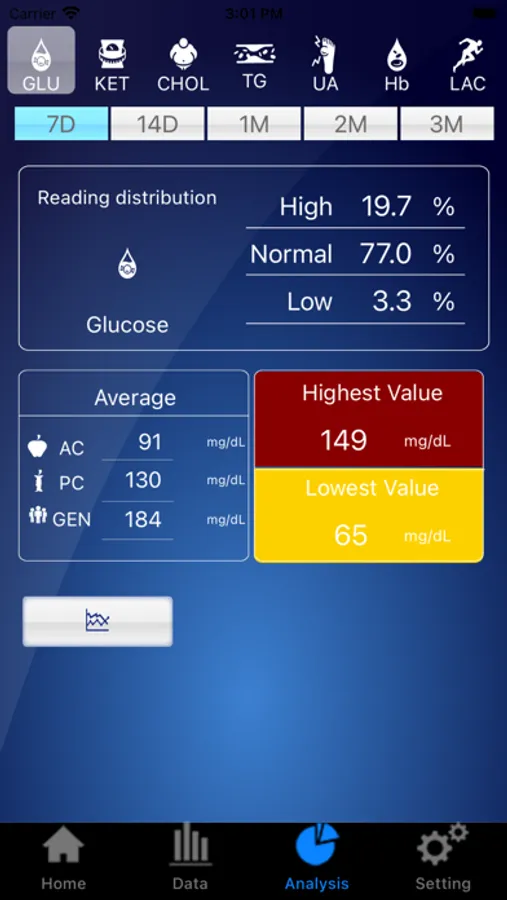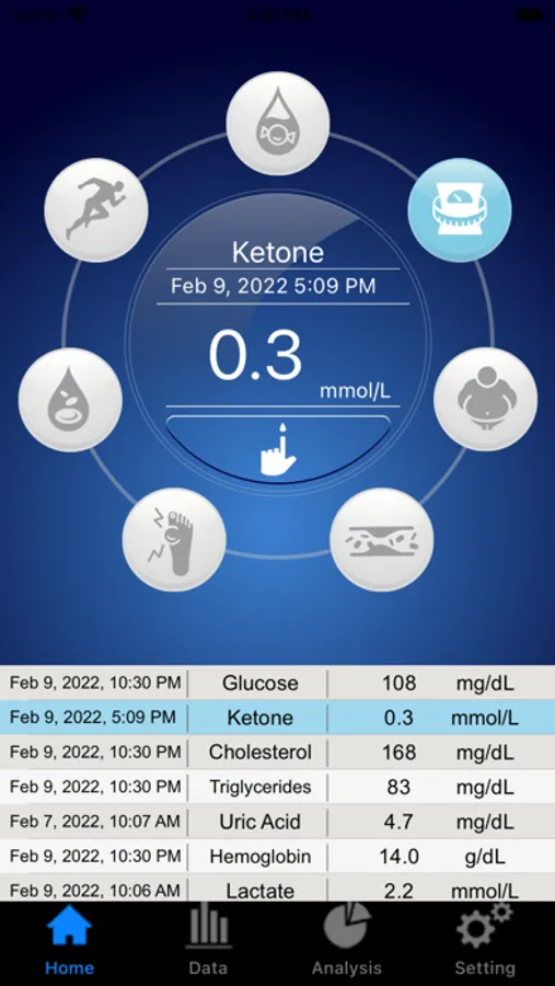 ProCheck provide an easy-to-use interface to track several parameters: Blood Glucose, Triglycerides, Ketone, Hemoglobin, Lactate, Uric Acid and Cholesterol.
