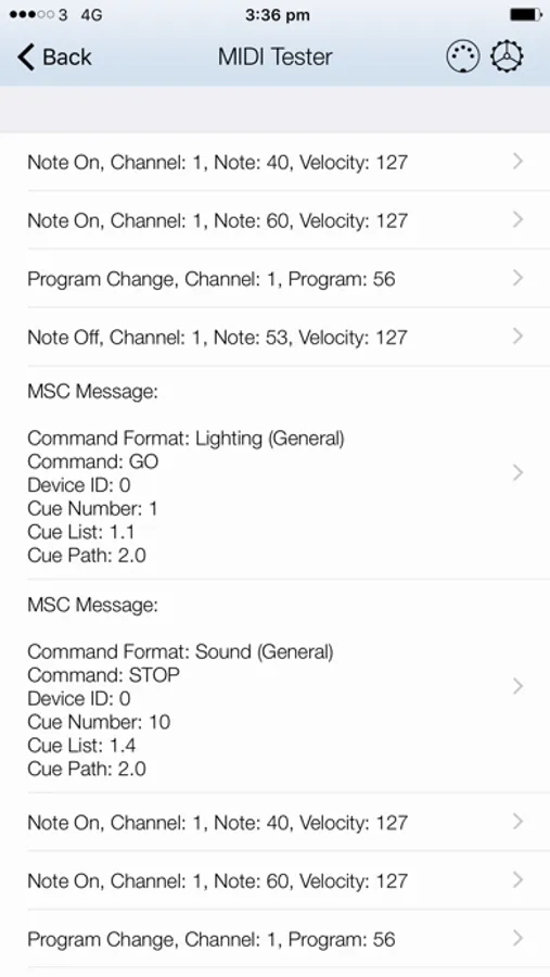 The MIDI Tester works in conjunction with any Made For iPhone compatible MIDI Interface, as well as Network and Bluetooth MIDI. It displays all the MIDI received into the phone, and is designed to help when fault finding any connectivity issues. As well as reading all standard MIDI messages, the MIDI Tester also reads all MIDI Show Control commands!