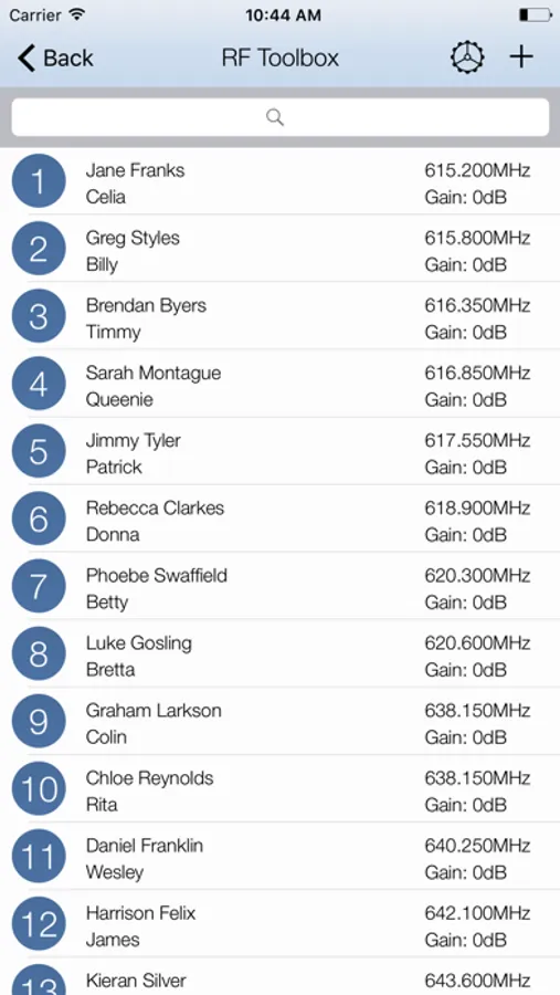 With RF Toolbox you can record all your transmitter information, including actor, character, frequency and gain information, in one place. You can record notes on each of your transmitters, for things like fitting and colouring information. Results are searchable by any of the recorded data. When you input frequency information, RF Toolbox will calculate the optimum aerial length, as well as the transmission channel.