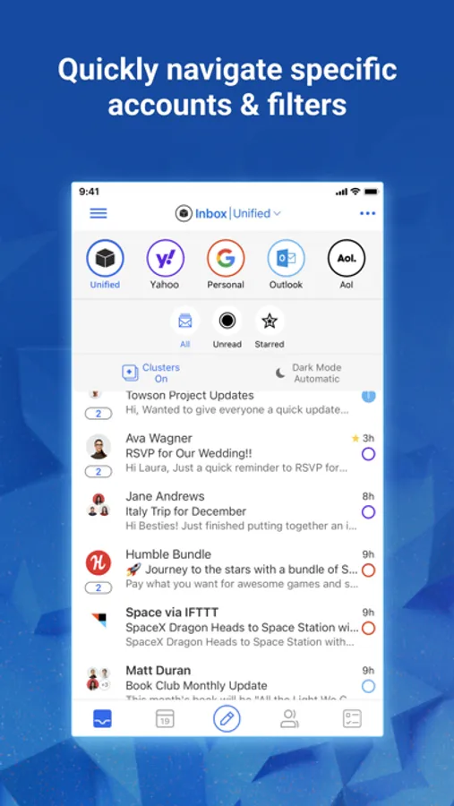 · Email Clusters: Organize similar emails together to remove clutter from your inbox. It categorizes emails from known senders into smart clusters, and organizes your emails into a sub-folder structure automatically, without the hassle of managing it manually