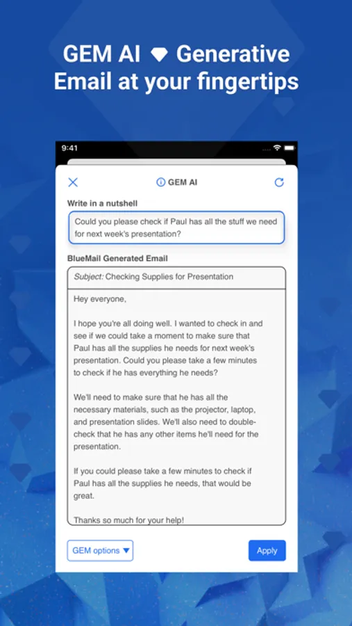 · BlueMail GEM AI leverages the power of OpenAI ChatGPT, enabling it to write high-quality emails quickly & efficiently. GEM AI suggests responses based on the context of the email, streamlining the communication process. GEM AI with GPT also provides condensed summaries best used for longer emails and conversations. By using BlueMail's artificial intelligence & machine learning capabilities, you save time and boost your productivity right within your inbox