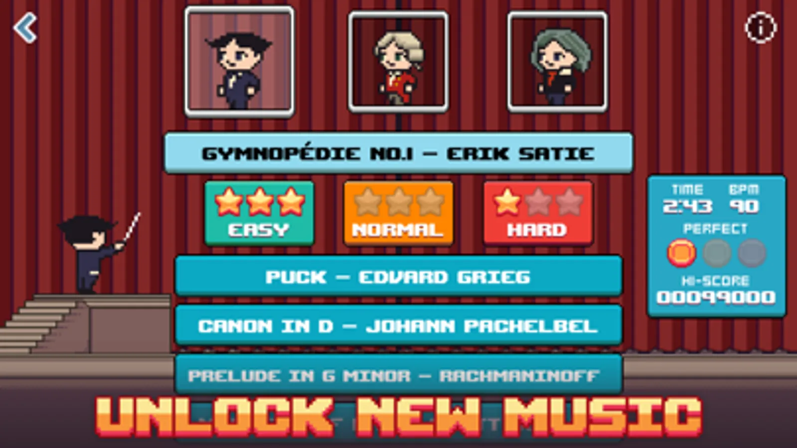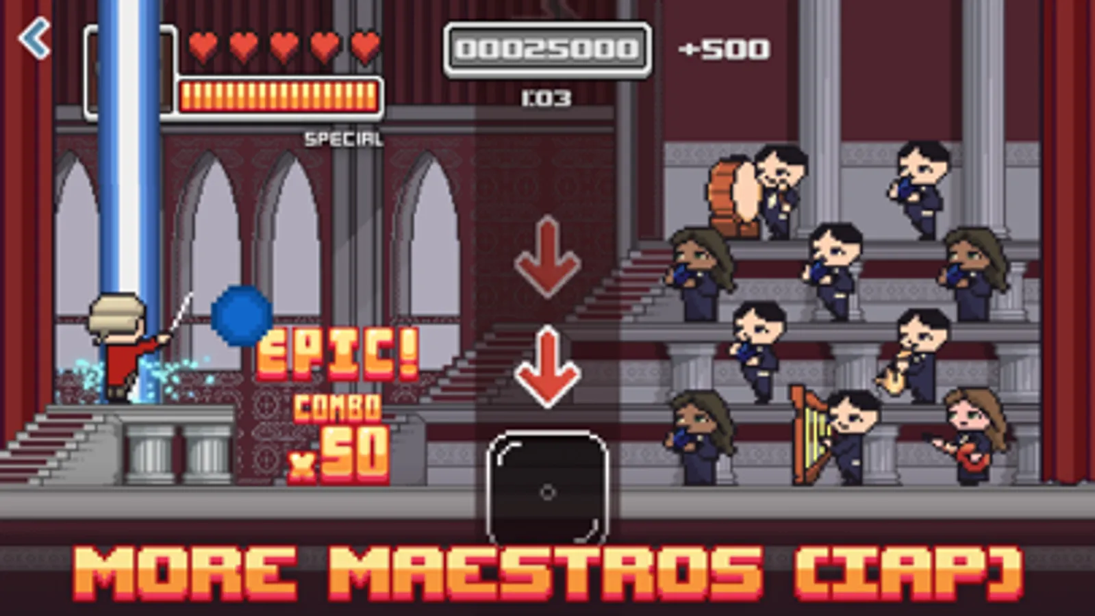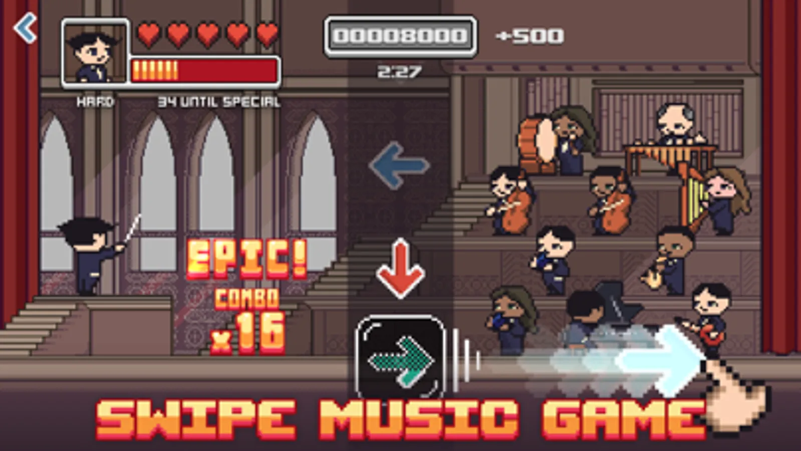 Feel the beat as you progress your way through various rhythmic challenges. With Epic Orchestra, you'll connect to these classic tunes like never before as you swipe your pixel baton left, right, up, and down.