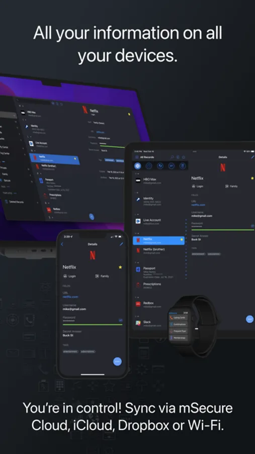 Choose to sync via mSecure Cloud, Dropbox, iCloud or Wi-Fi to access your records on all of your devices across multiple platforms.