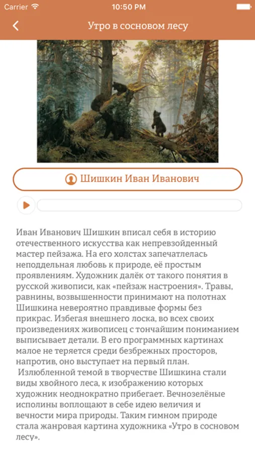 Наши искусствоведы описали все картины, которые имеют свой номерок в Третьяковке (т. е. все самые известные картины русских художников), а профессиональный диктор озвучил их. Список работ постоянно пополняется и обновляется синхронно со списком экспонатов Третьяковской Галереи.