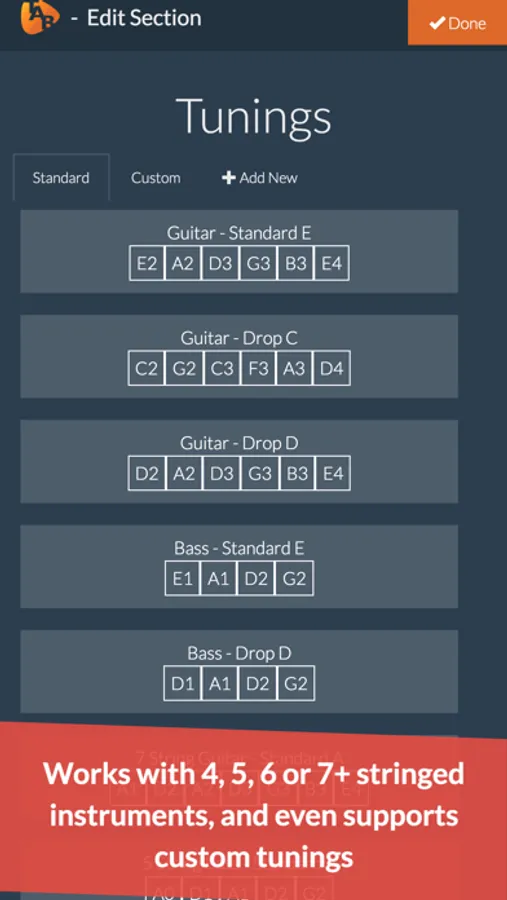 - Add any number of strings and custom tunings including 4,5,6 and 7 string guitars/bass guitars