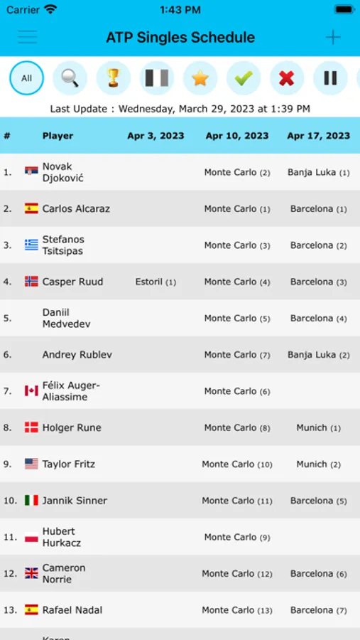 • Main tour, Challengers and ITF/Futures with qualies