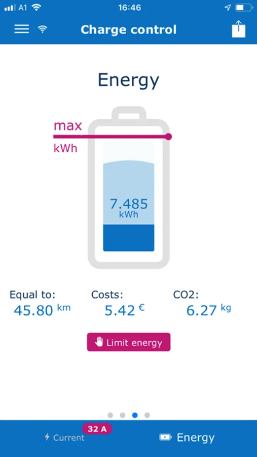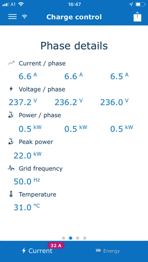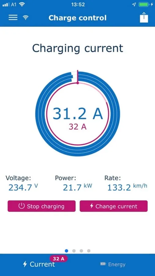 Control your NRGkick Classic comfortably from your smartphone and configure and use many smart features. Configure settings for photovoltaic-led charging or automatic reports via email, set the charging power and charging current, and get access to the device-integrated energy meter. Always keep full track of your charging processes! The NRGkick Classic app visualizes various parameters such as voltage, current, power and energy. You can change the current during charging in 1A increments from 6A-32A. Charging cost, average energy consumption, range, CO2 savings and other useful information are displayed and recorded.