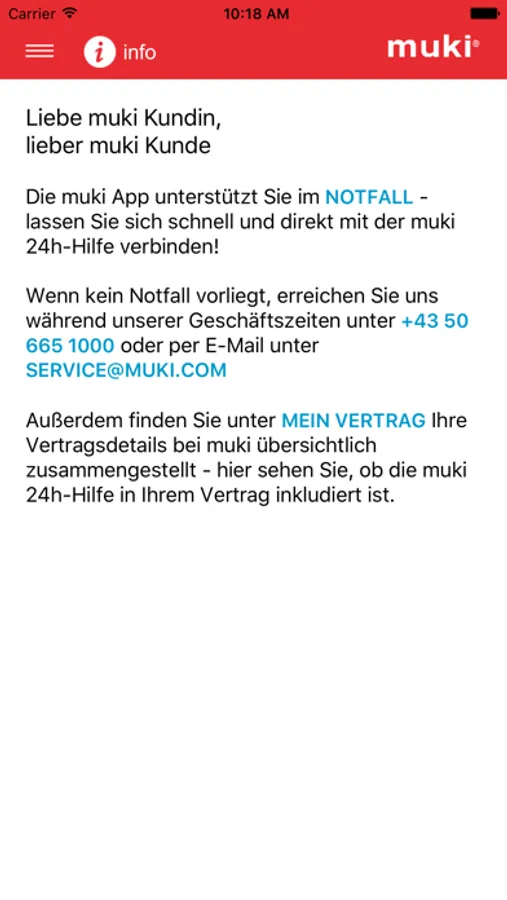 Im Notfall verbindet die muki App Sie direkt mit unserer telefonischen muki 24h-Hilfe. Diese Hotline informiert, berät und organisiert sofort Hilfe- und Beistandsleistungen. Damit Sie nicht allein sind, wenn es darauf ankommt! Außerdem trägt die muki 24h-Hilfe die vertraglich vorgesehenen Kosten für Ihre direkte Hilfe.