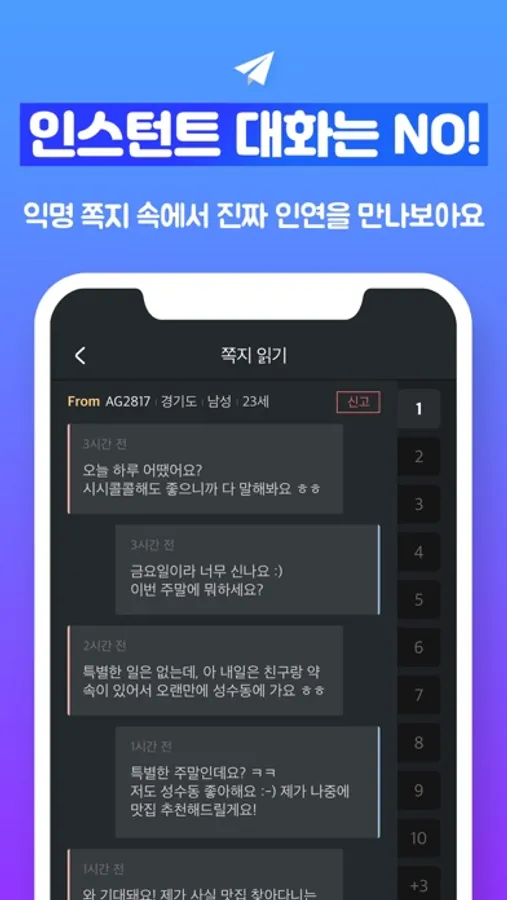 여러명에게 보내기, 동성에게도 보내기, 같은 지역에게만 보내기 등 다양한 옵션으로 쪽지를 보낼 수 있습니다