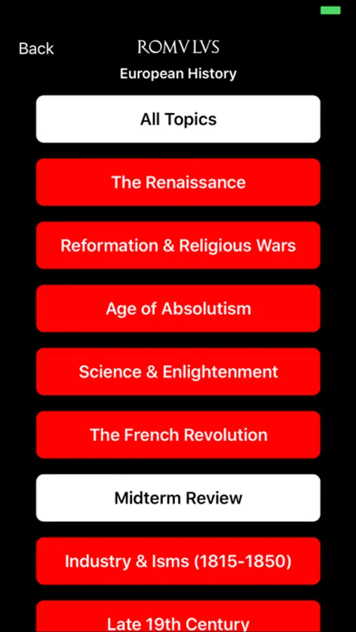 Romulus European History is a quiz-based application of iOS devices designed to help students review for exams in European History, such as AP European History and IB History of Europe and the Islamic World, as well as for unit tests and mid-term exams. Our goal in designing this program is to allow students to reinforce their content knowledge in a fun, quick and accessible way.