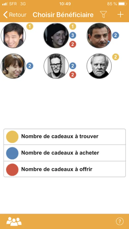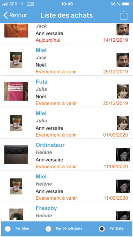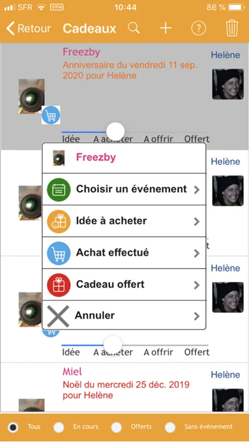 * Saisissez les noms, les évènements : anniversaire, Noël …, attribuez des idées de cadeaux avec photos puis faites évoluer le statut de vos cadeaux : « à trouver », « à acheter », « à offrir » puis « offerts ».