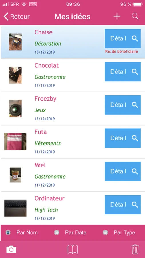 • Liste des idées cadeaux : attribuables à tous les bénéficiaires, avec photo, budget et détails, magasin …classer par thèmes, à enrichir à volonté.