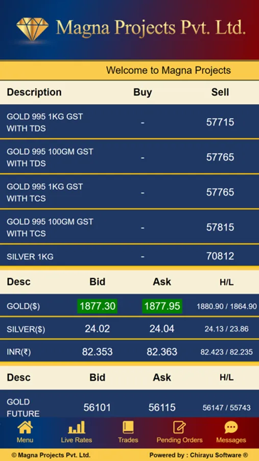 Magna projects has be start in Magna Bullion on 2001.Magna Bullion is a leading bullion dealer at Kolkata - India. We have laid a thrust in the Bullion market in all over India. We are providing our live rates now through ios app