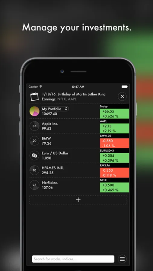 With Market Junkie you can easily manage you stock portfolio and keep an eye on the market. Intuitive management, integrated stock search and charts (intraday and longtime) make your life and investment easier.