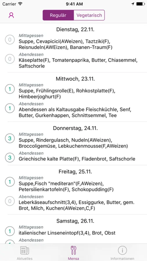 - Betrachten der Speiselisten und Möglichkeit zur Anmeldung für Mahlzeiten in der Mensa (PRIMUSS-, Netzwerk- oder Gast-Kennung erforderlich)
