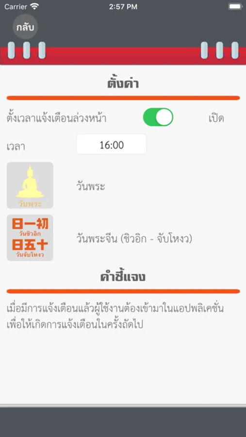 ด้วยหน้าจอที่ใช้งานง่าย อีกทั้ง สามารถแจ้งเตือนล่วงหน้า 1 วันสำหรับ วันพระไทย และวันพระจีน