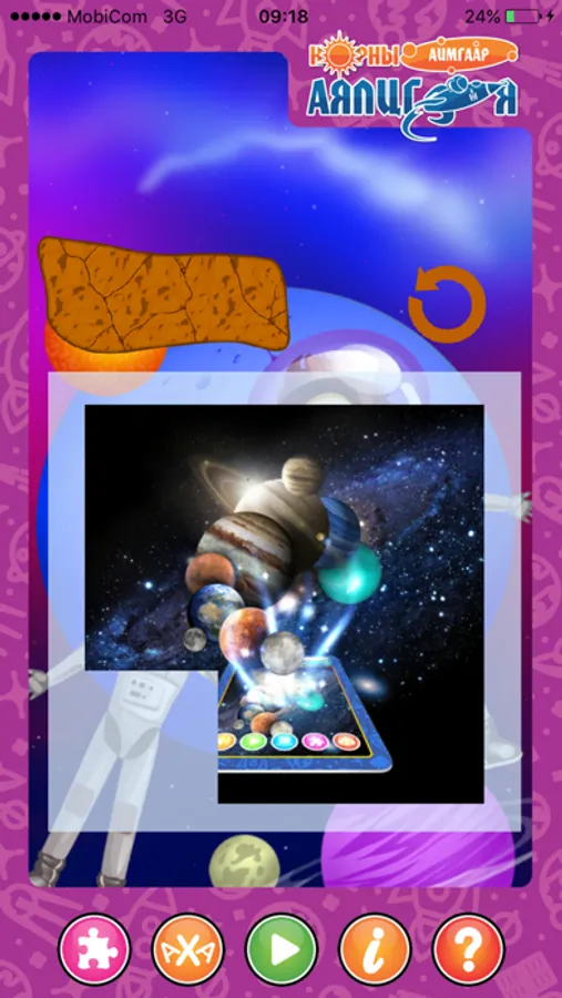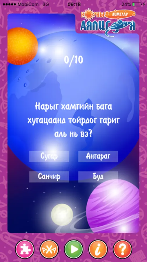 Энэхүү “Нарны аймгаар аялцгаая” ухаалаг карт нь хүүхдүүд бодитоор харах боломжгүй нарны аймгийн гарагуудыг 3 хэмжээст хөдөлгөөнт дүрслэлээр харуулж ид шидийн мэт ертөнцөөр аялуулахаас гадна мэдлэг шалгах АХА тоглоом, сэтгэхүй хөгжүүлэх эвлүүлдэг тоглоом зэргийг багтаасан.