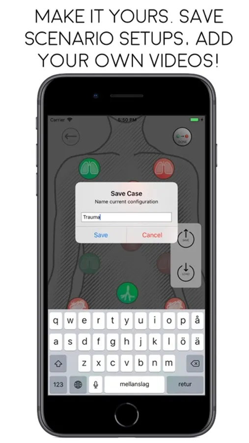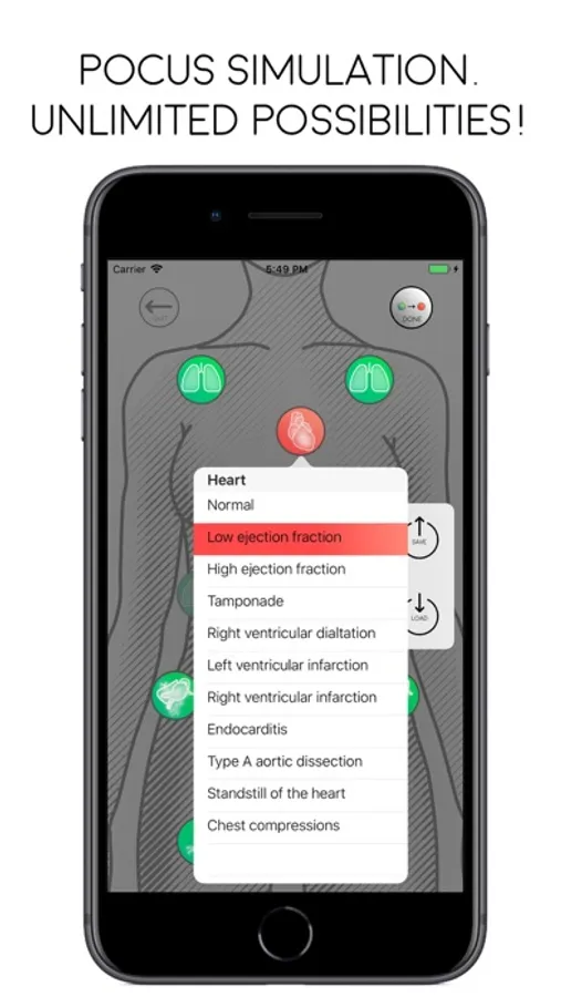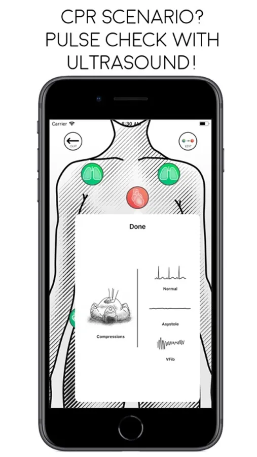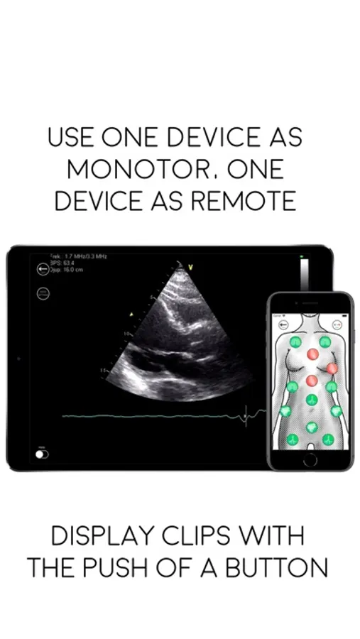 Use the app when training with usual mannequins or even live actors! Can easily be used as an examination tool for basic P.O.C. ultrasound courses. Add a probe to the monitor for improved fidelity!