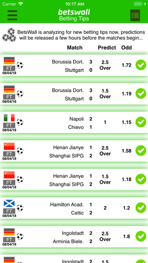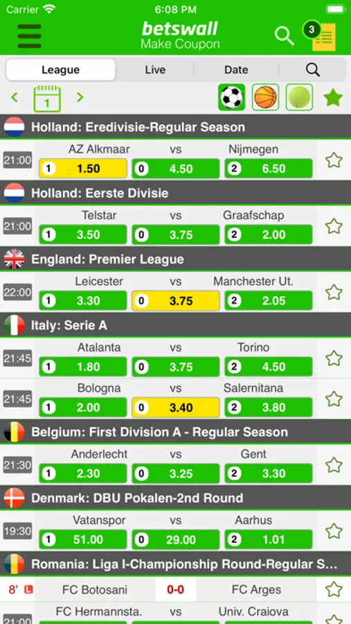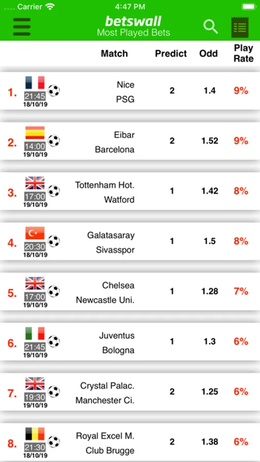 • Set your favorite matches and BetsWall will notify you all match events; start time, goals, red cards, half time, end time etc.