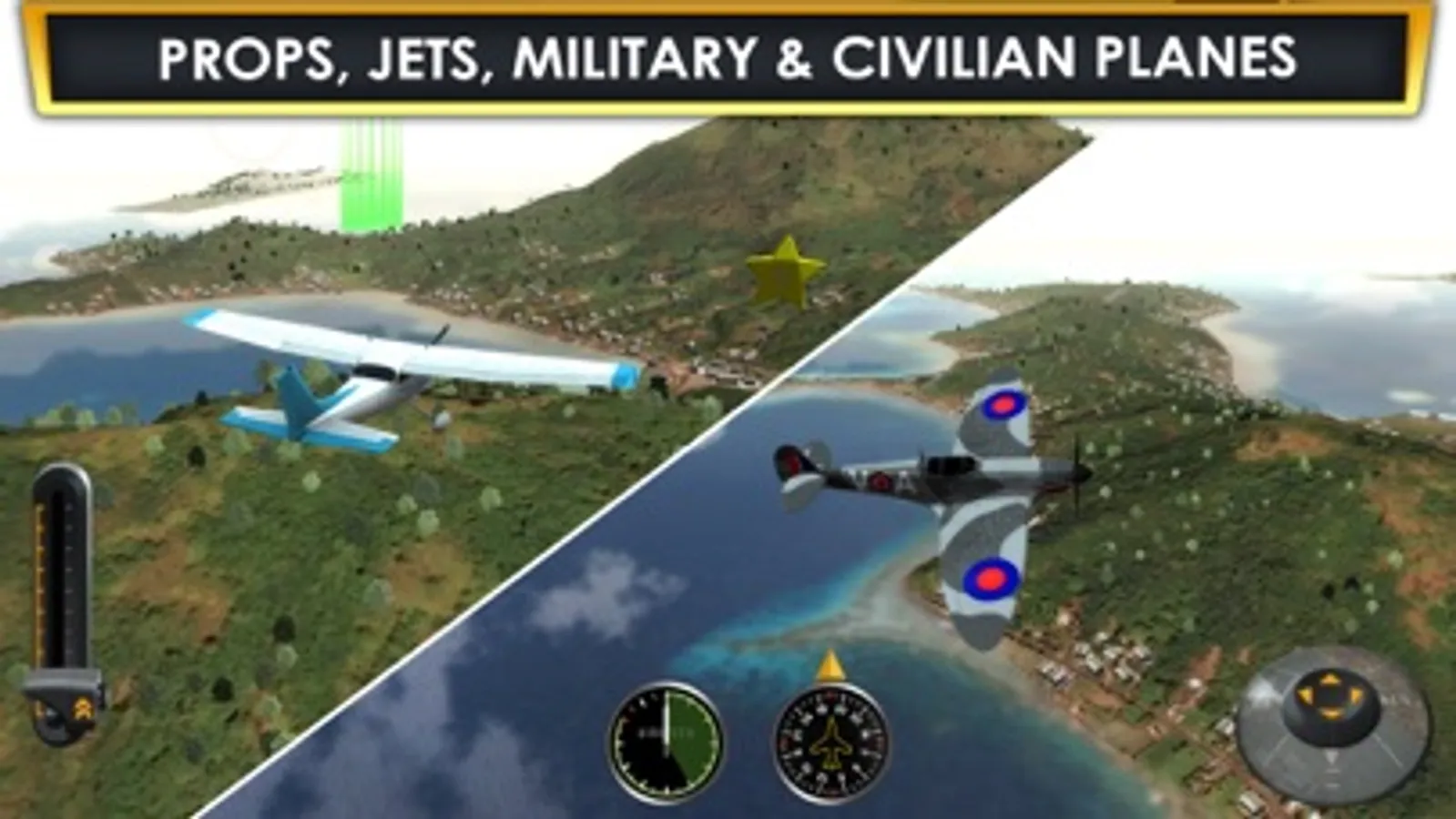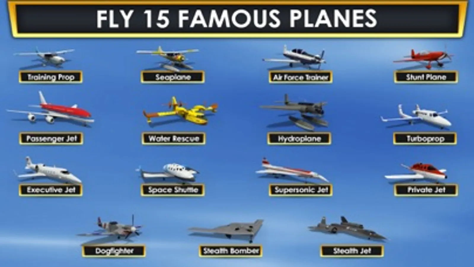 Fly 15 Amazing Aircraft including Civilian Passenger Jets, Military Stealth Planes, Private Jets, Training Props and World War 2 era planes.