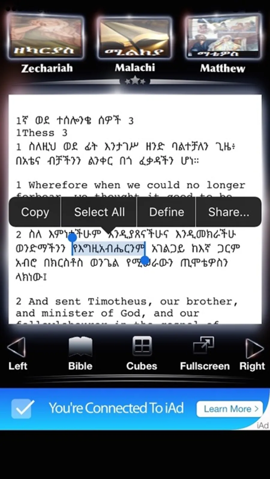Description: By READING the Holy Bible you are letting the Words of Life change you, inspire you, and strengthen you.We are please to announce that you can download IT to use offline, This Amharic Holy bible have, King james version (KJV) of the bible is included with the app, and other popular translations ESV for free. This app is more than just an e-reader, this app links your bible reading with outstanding 3D features for an in-depth study experience. You can read 4 bible books simultaneously into a 3D cube, its excellent for compare bible verses. No Internet needed.