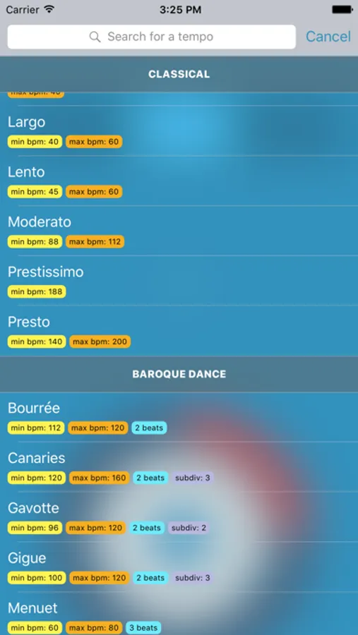 - predefined classical tempi (Adagio - Andante - Allegro...) as well as a few Baroque dances (Sarabande, Menuet...) and Ballroom dances