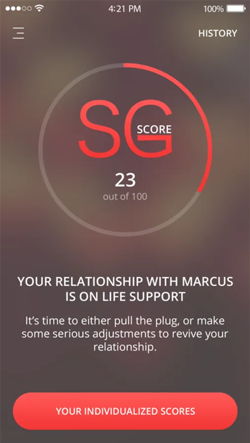 1. SG Score is a numerical scoring system that identifies your relationship’s strengths and weaknesses on a scale from 1-100. Get your scores and pat yourself (and partner) on the back, work harder at improving certain aspects of your relationship, or decide that it’s time to move on.