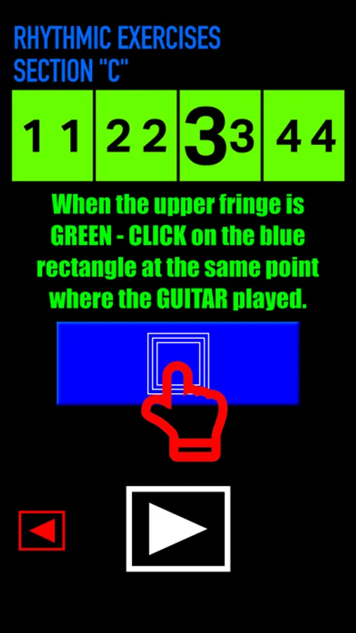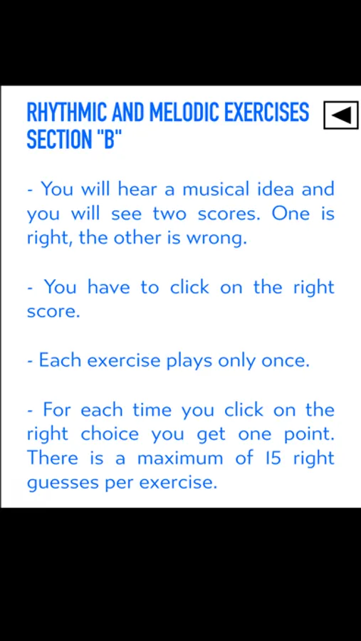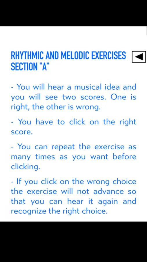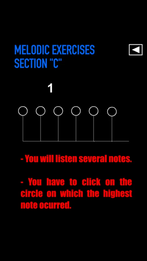 SECTION “C” has a different type of ear training exercises which are not related to any written music. Rhythmic exercises on this section are to practice the ability to reproduce a rhythmic combination just by listening to it. On the melodic exercises of this section you will listen a series of sounds and you have to recognize the higher one.