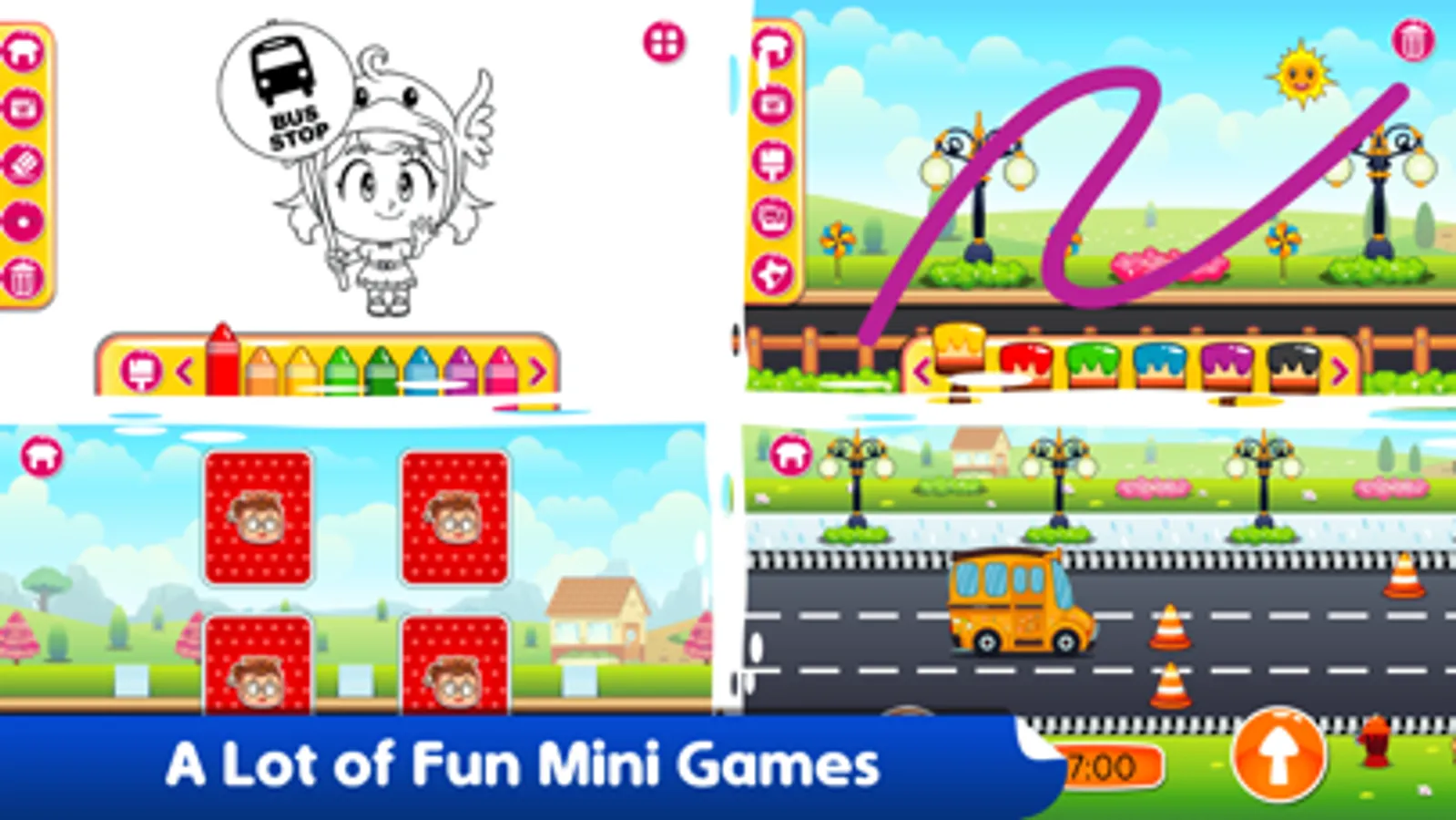 > 6 fun and educational mini games including Memory Games, Coloring Books, Sticker Books, Super Drive, Racing, and School Bus.