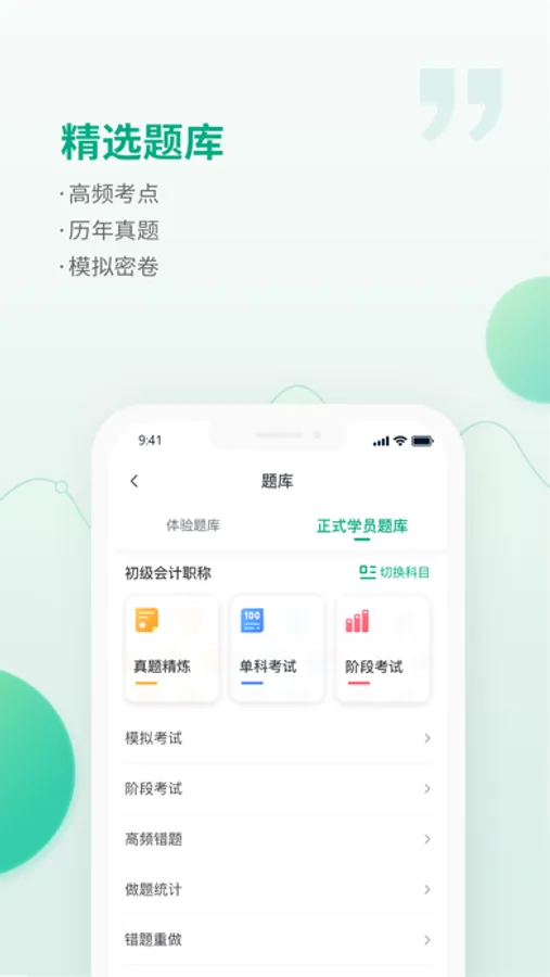 (2)我的题库:海量题库、章节练习、模拟考试、错题重做等功能
